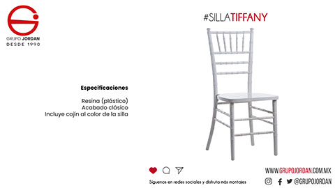 Nuestra silla tiffany disponible en resina de color blanco o chocolate. Esta silla incluye cojín al color de la silla tiffany. Es un modelo que es clásico en los eventos y le da un toque elegante a tu evento.